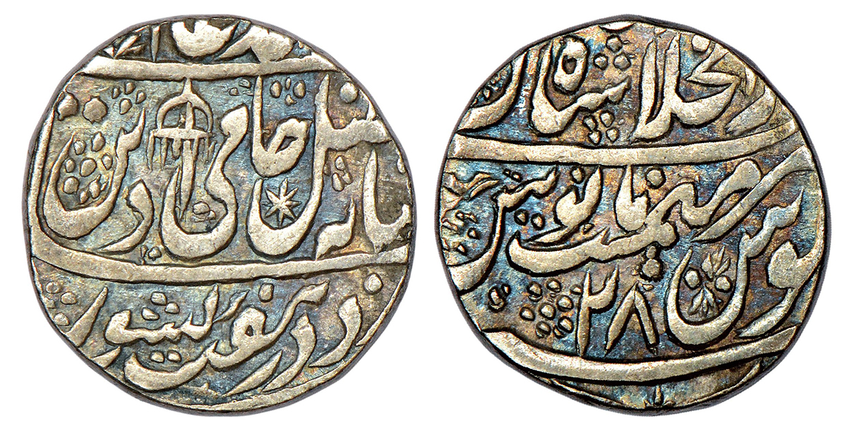 Shah Alam II (1759-1806 AD), silver rupee, Dar ul-Khilafat Shahjahanabad mint, 'Fazle Hami-e-din' couplet, Parasol (Chhatra) mint-mark on obverse, RY 28, KM 709.2, 11.06g.