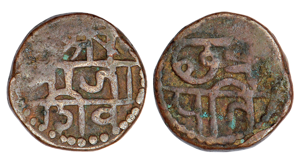 Maratha 'Swarajya' - copper 'Sajgani/Shivarai' paisa, in the name of Chhatrapati Shivaji (1674-1680 AD), so-called 'lifetime issue' with dotted borders on either side, M&W T1, 11.80g. Obv: Nagari legend Shri Raja Shiva in three lines. Rev: Nagari legend Chhatra Pati in two lines.