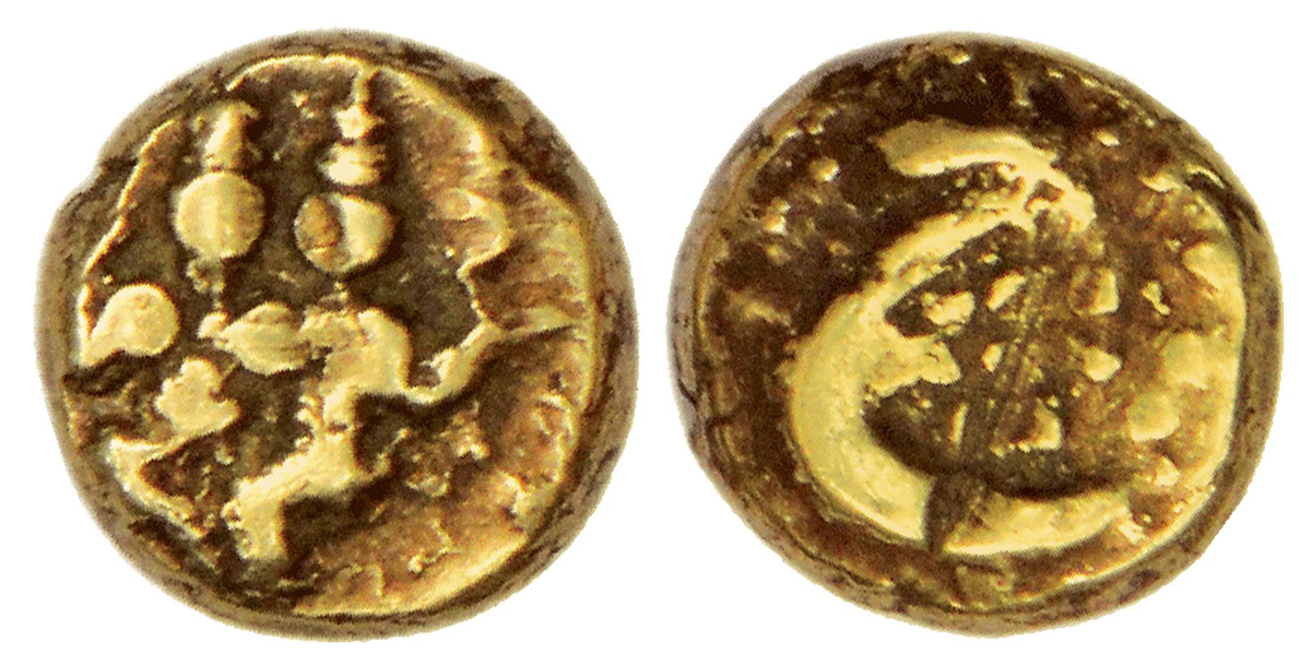Mysore, Haidar Ali (1761-1782 AD), gold fanam, KM 8, 0.39g. Obv: Shiva Parvati seated. Rev: Persian letter 'He' for Haidar Ali in granulated field.