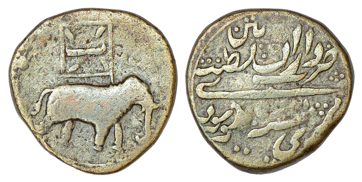 Mysore, Tipu Sultan (1787-1799 AD), copper 2 paisa (mushtari), Patan mint, KM 124.6, 21.23g. Obv: Elephant facing right, above Persian 'Be' within flag. Rev: Persian legend zarb dar us-sultanate, pattan mushtari sanah maludi and date.