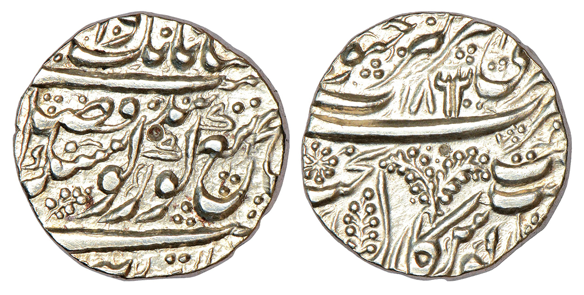 Sikh Empire, Ranjit Singh (1799-1839 AD), silver rupee, Amritsar mint, VS 1862, 'Ber Shahi' type, G. Singh 01.29.01; Herrli 01.13.04, 11.05g. Obv: 'Nanakshahi' couplet, version V: a beautiful ber leaf symbol below the word 'singh'. Rev: 'Julus' formula with bershahi leaf (double sprig) symbol and rosette symbol at left.