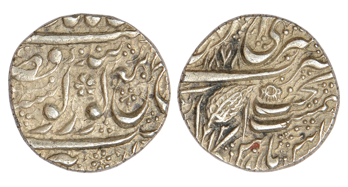 Sikh Empire, Ranjit Singh (1799-1839 AD), silver rupee, Amritsar mint, VS 1878, digit '2', G. Singh 1.45.02; Herrli 01.07.04, 11.12g. Obv: 'Nanakshahi' couplet, version V; rosette symbol between 'Guru' and 'Gobind', rosette below 'Singh'. Rev: 'Julus' formula with Ber leaf symbol; Arabic digit '2' below the leaf and chakkar (Sikh weapon) symbol to right.