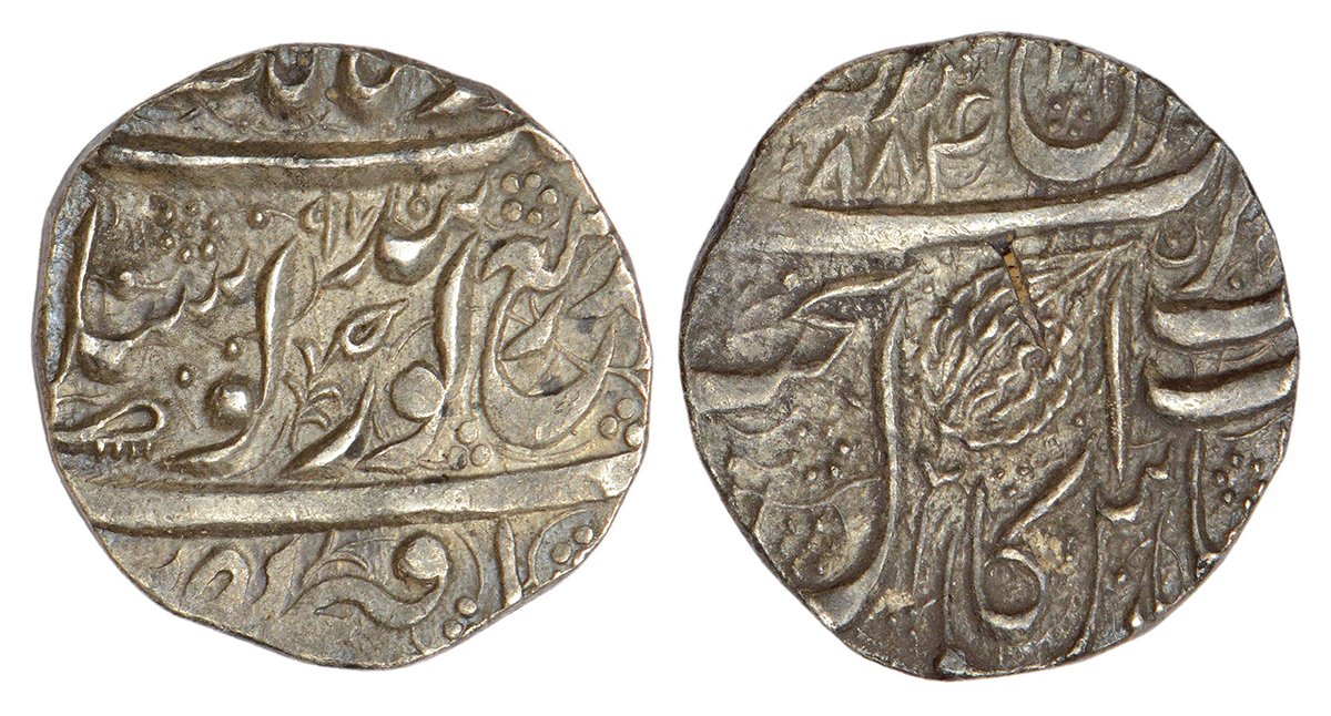 Sikh Empire, Kharak Singh (1839-1840 AD), silver rupee, Amritsar mint, fixed date VS 1884/ moving date VS 97, 'Lotus bud' type, G. Singh 01.83.01, Herrli 1.21.04, 11.00g. Obv: 'Gobindshahi' couplet, version Ib; beautiful Lotus bud symbol nicely placed between 'Guru' and 'Gobind' and Arabic number 97 in small numerals. Rev: 'Julus' formula with Ber leaf symbol, Persian 'noon' above 'takht'.