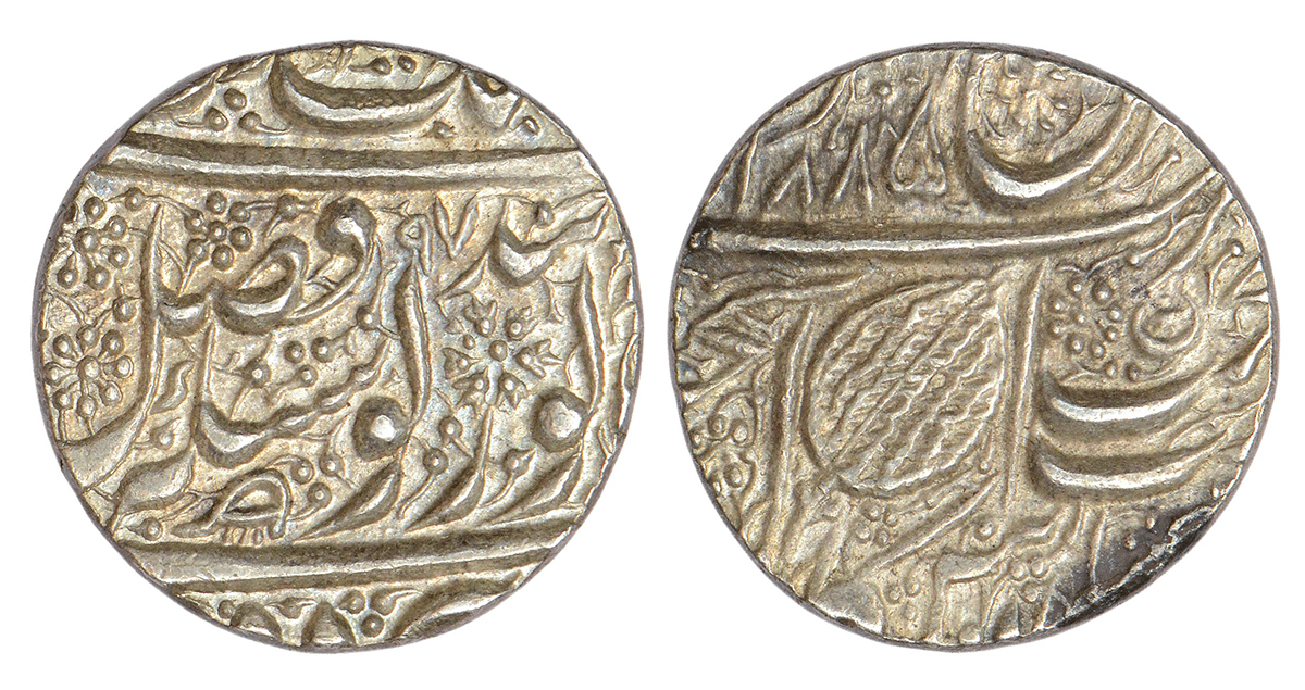 Sikh Empire, Kharak Singh (1839-1840 AD), silver rupee, Amritsar mint, fixed date VS 1885/ moving date VS 97, G. Singh 01.60.01, 11.14g. Obv: 'Nanakshahi' couplet, version V; tufts rosette (aarsi-like) symbol between 'Guru' and 'Gobind'; comb (kanghi) symbol below 'Singh'. Rev: 'Julus' formula with Ber leaf symbol, cluster of dots (flower) and small sun-face symbol within crescent to right.