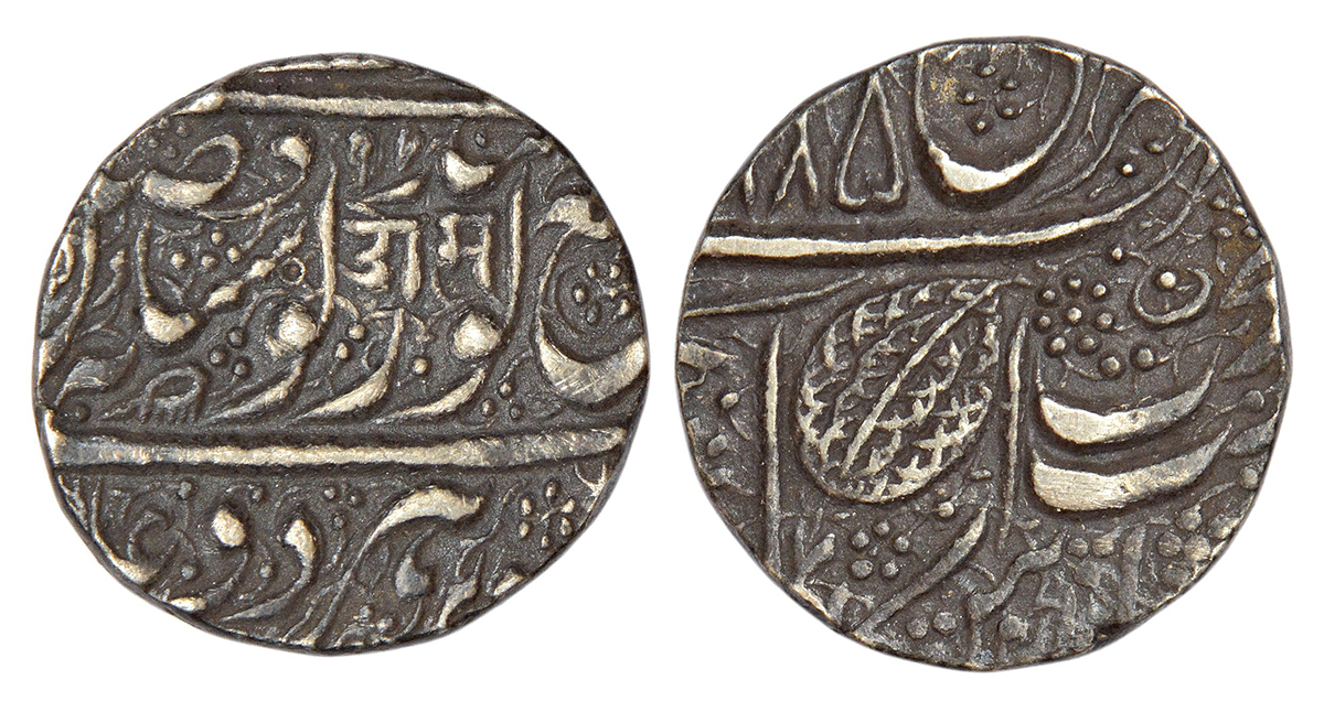 Sikh Empire, Kharak Singh (1839-1840 AD), silver rupee, Amritsar mint, fixed date VS 1885/ moving date VS 97, 'OM’ in Devanagari, G. Singh 01.60.02; Herrli 01.11.04, 11.04g. Obv: 'Nanakshahi' couplet, version V; Devanagari word 'OM’ between 'Guru' and 'Gobind', comb (kanghi) symbol below 'Singh'. Rev: 'Julus' formula with Ber leaf symbol, Persian 'noon’ with dotted flower arrangement at right above 'takht'.