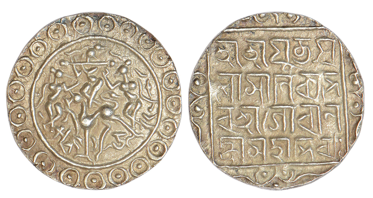 Tripura, Yaso Manikya (2nd reign 1600-1618 AD), silver tanka, with citing Queens Gauri and Lakshmi, SE 1522, R&B -T 197, 10.60g. Obv: Krishna standing on lion facing left, playing flute, two Gopis on each side of Krishna, date below, all within a circle with an outer border of beaded annulets. Rev: Bangla legend Sri Sri Yuta Ja/so Manikya De/va Sri Gauri La/kshmi Mahadevayah in four lines, within a square with ornamented border.