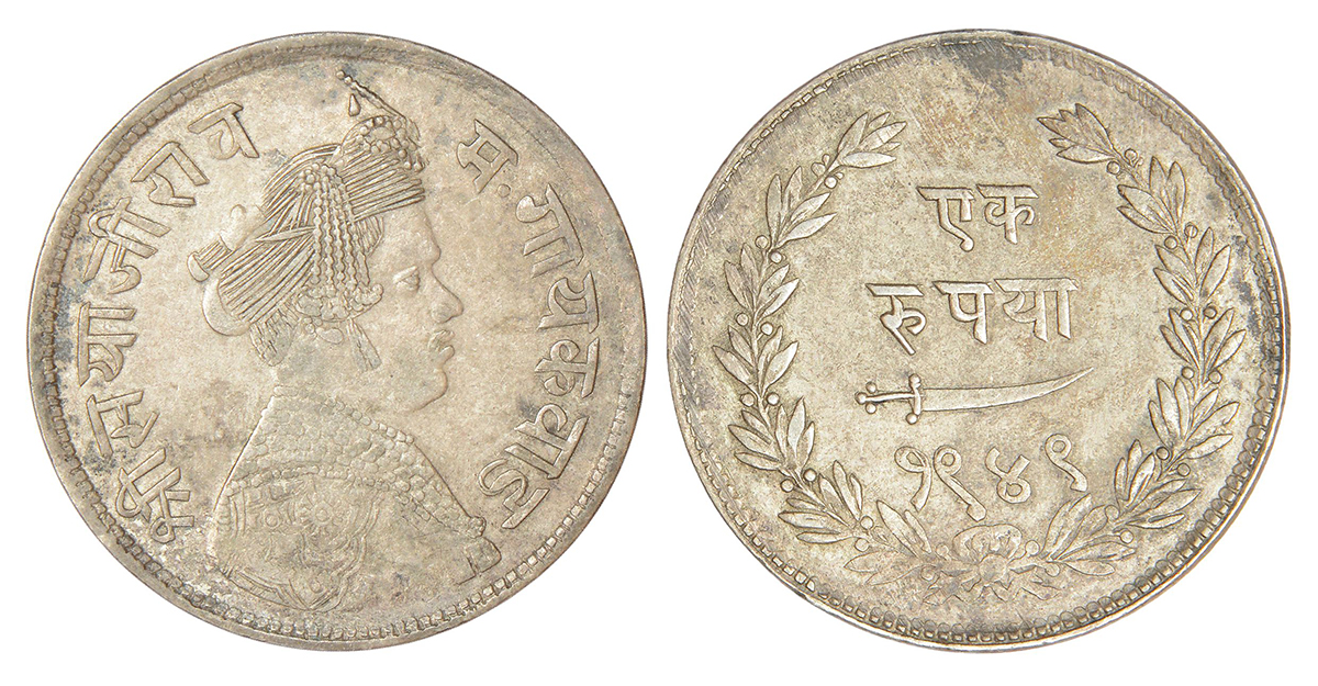 Baroda, Sayaji Rao III (1875-1938 AD), silver rupee, VS 1949, KM Y36, 11.30g. Obv: Portrait bust of Sayaji Rao III. Rev: Denomination, scimitar and date within wreath.