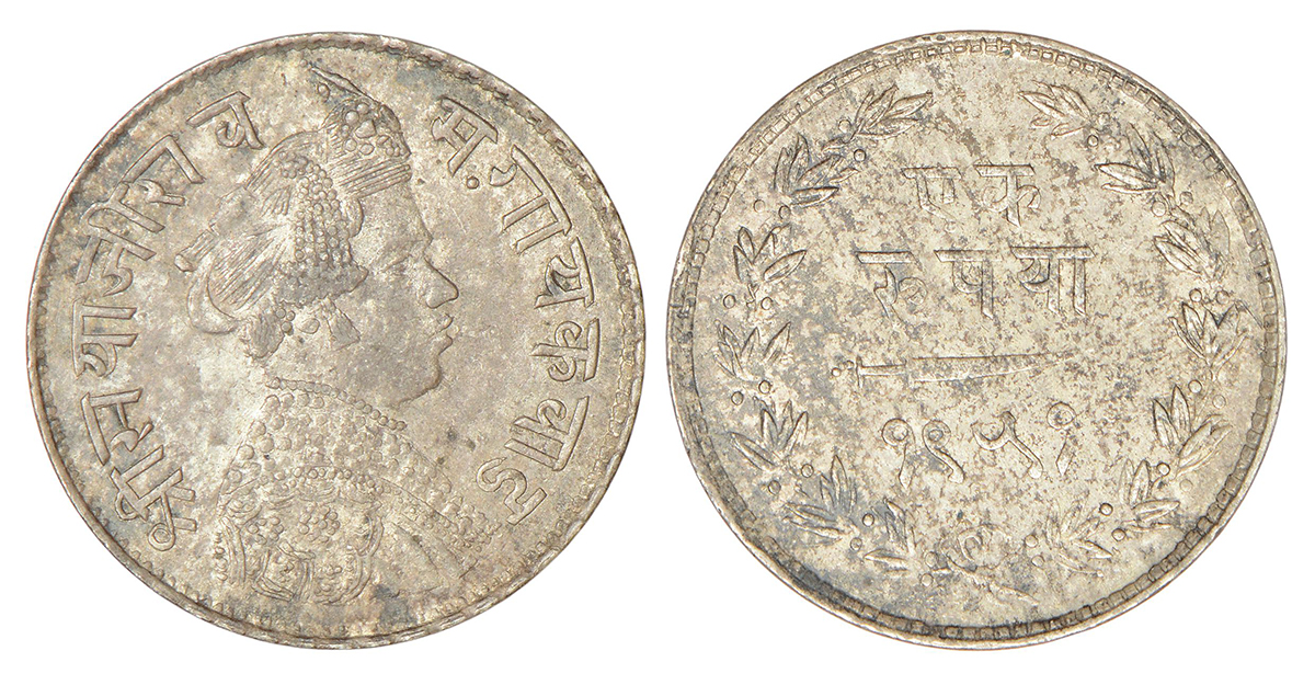 Baroda, Sayaji Rao III (1875-1938 AD), silver rupee, VS 1949, KM Y36, 11.30g. Obv: Portrait bust of...
