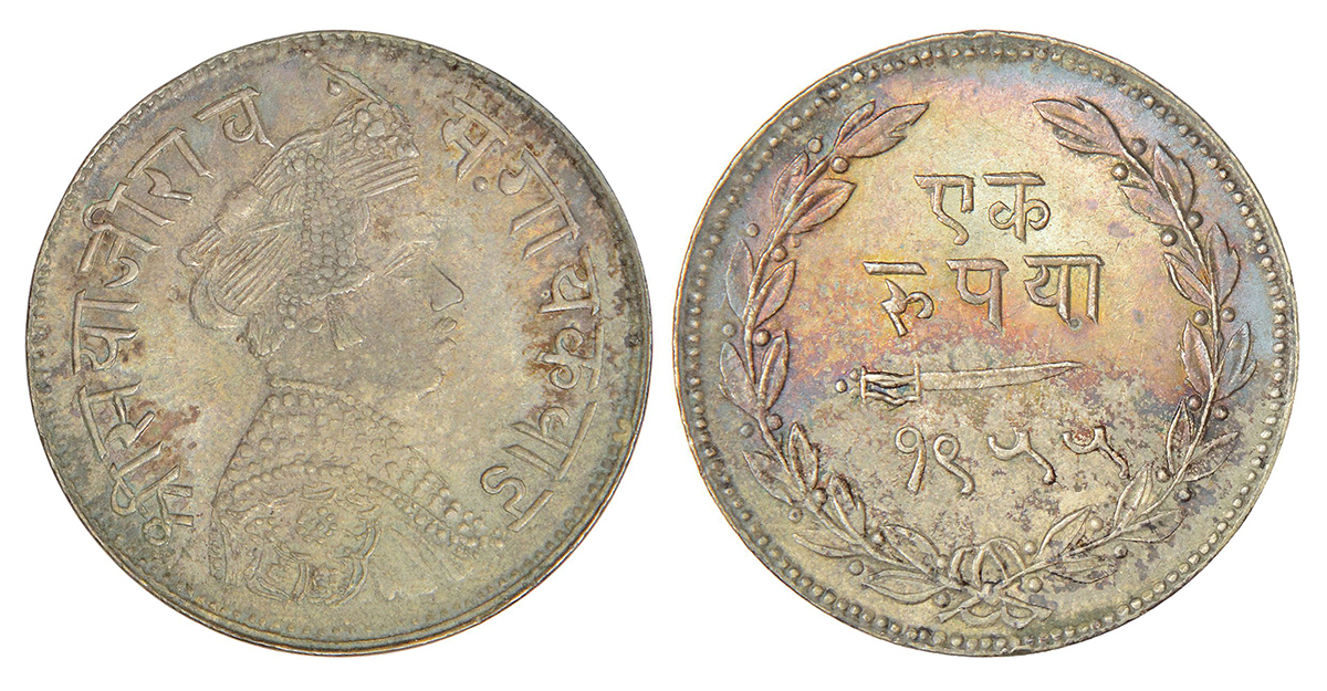 Baroda, Sayaji Rao III (1875-1938 AD), silver rupee, VS 1955, KM Y36a, 11.37g. Obv: Portrait bust of Sayaji Rao III. Rev: Denomination, scimitar and date within wreath.