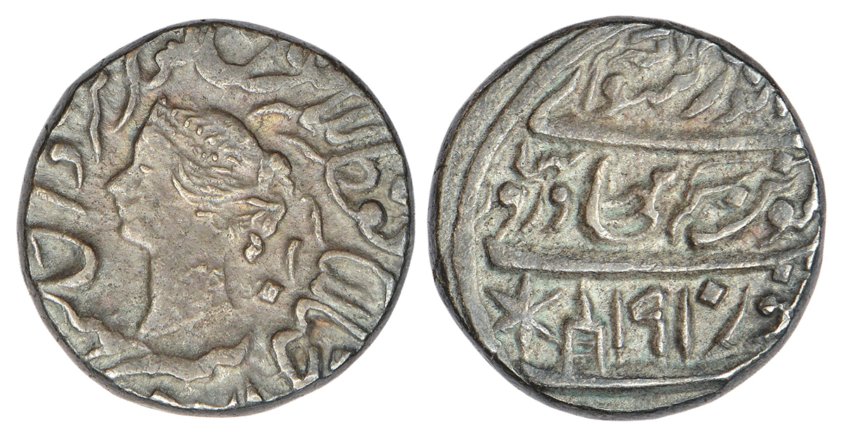 Bharatpur, Jaswant Singh (1853-1893 AD), silver rupee, Braj Indrapur (Bharatpur) mint, VS 1910, KM 157, 11.07g. Obv: Portrait bust of Queen Victoria in center around Persian legend around. Rev: Persian legend jaswant singh bahadur, zarb braj indrapur bharatpur with VS date, dagger and star mintmark.