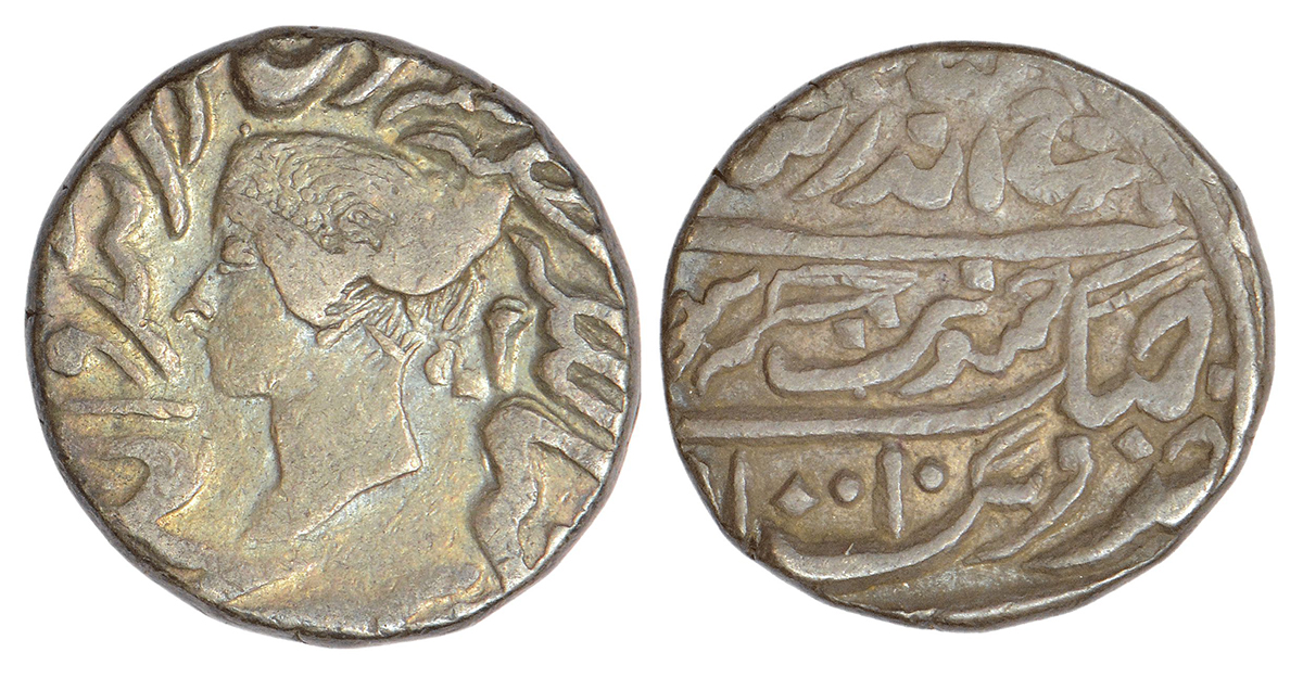 Bharatpur, Jaswant Singh (1853-1893 AD), silver rupee, Dig Braj Indrapur mint (fully visible), VS (19)10, KM 176, 11.06g. Obv: Portrait bust of Queen Victoria in center around Persian legend around. Rev: Persian legend jaswant singh bahadur, zarb dig braj indrapur and VS date.
