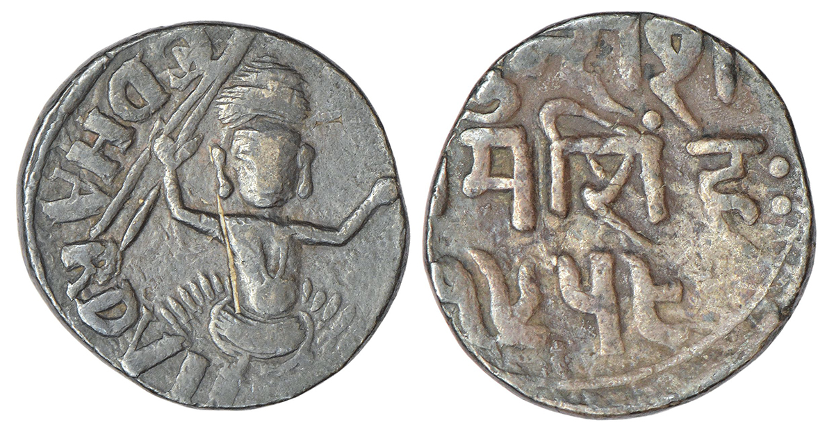 Bundi, Raghubir Singh (1889-1927 AD), error silver rupee, with the name of Edward VII (Letter 'H' instead of 'W' in Edward), VS 1958, KM Y11, 10.63g. Obv: Seated figure holding Katar. Rev: Devanagari legend Bundish Ram Singh and VS date.
