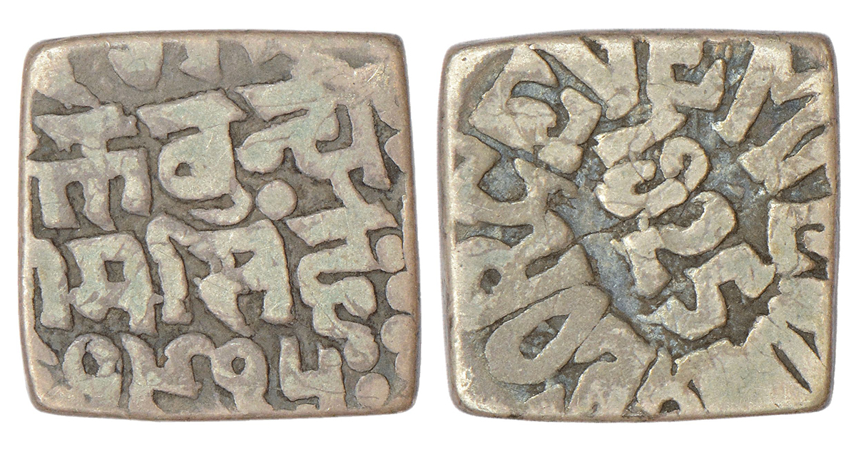 Bundi, Raghubir Singh (1889-1927 AD), silver square ‘Nazarana’ rupee, with the name of George V, AD 1925/VS 1915 (sic.), KM Y20a, 10.31g. Obv: English legend EMPEROR GEORGE V around, with AD date in center. Rev: Devanagari legend Bundish Ram Singh and VS date.