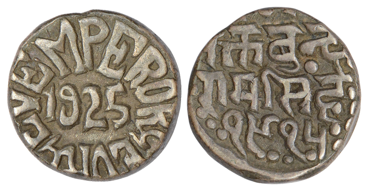 Bundi, Raghubir Singh (1889-1927 AD), silver rupee, with the name of George V, AD 1925/VS 1915 (sic.), Zeno #92625; KM Y20, 10.63g. Obv: English legend EMPEROR GEORGE V around, with AD date in center. Rev: Devanagari legend Bundish Ram Singh and VS date.