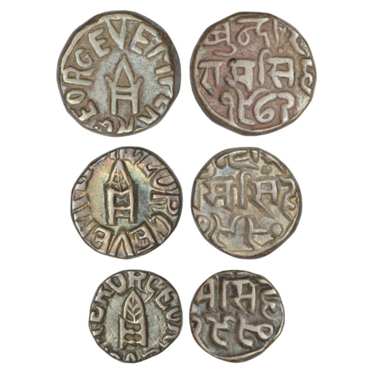 Bundi, Raghubir Singh (1889-1927 AD), set of 3 silver coins, with the name of George V, 1x rupee, VS 1972, KM Y18.1, 10.63g; 1x ½ rupee, VS 1980, KM Y17.2, 5.30g and 1x ¼ rupee, VS 1980, KM Y16.2, 2.70g. Obv: English legend EMPEROR GEORGE V around, with Katar symbol in center. Rev: Devanagari legend Bundish Ram Singh and VS date. (3 coins)
