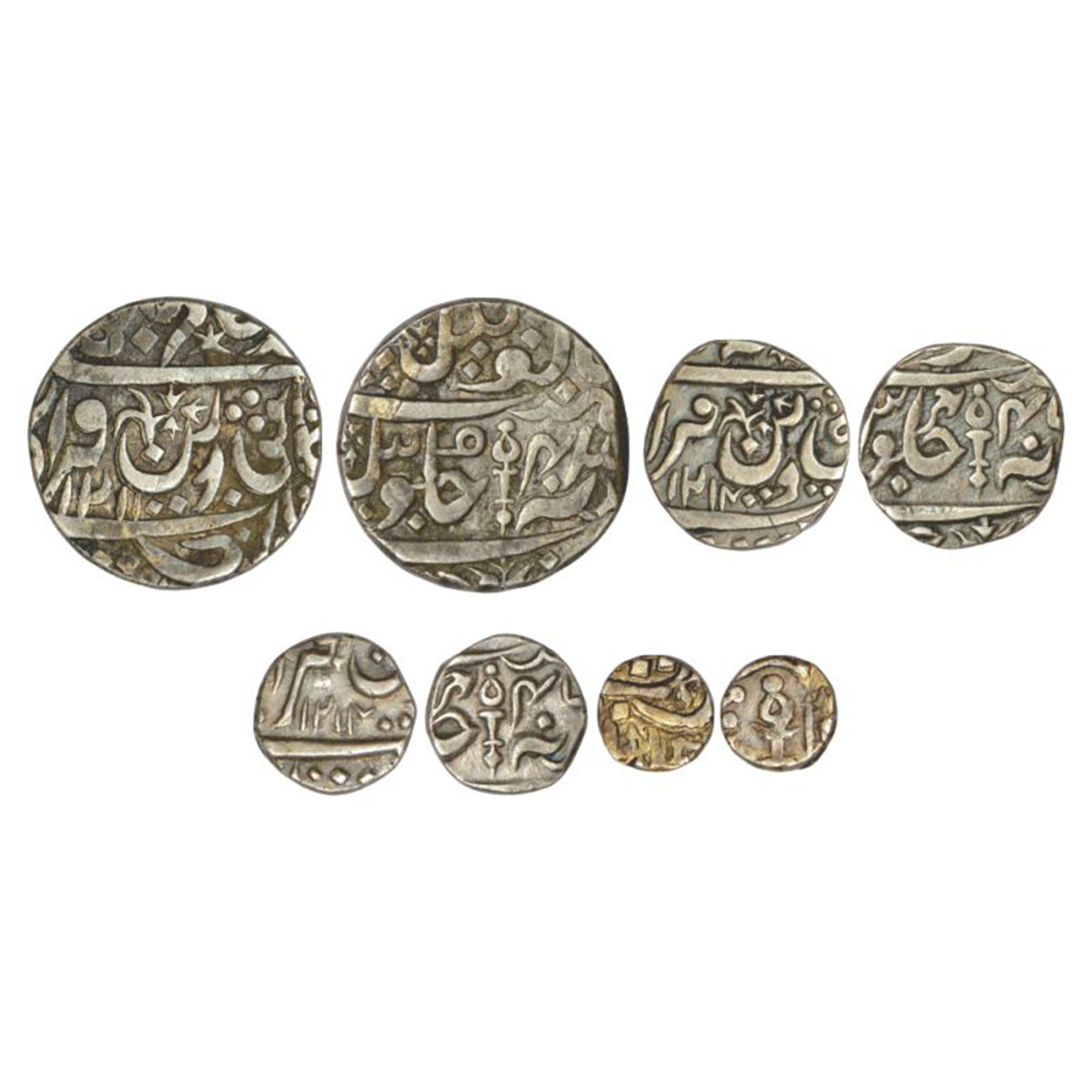 Datia, Gaja Shahi series, set of 4 silver coins, 1x rupee, AH 1211/RY 43, KM C38, 10.78g; 1x ½ rupee, AH 1214/RY 4x, KM C37, 5.39g; 1x ¼ rupee, AH 1214/RY 46, KM C36, 2.70g and 1x ⅛ rupee, KM C35, 1.34g. (4 coins)
