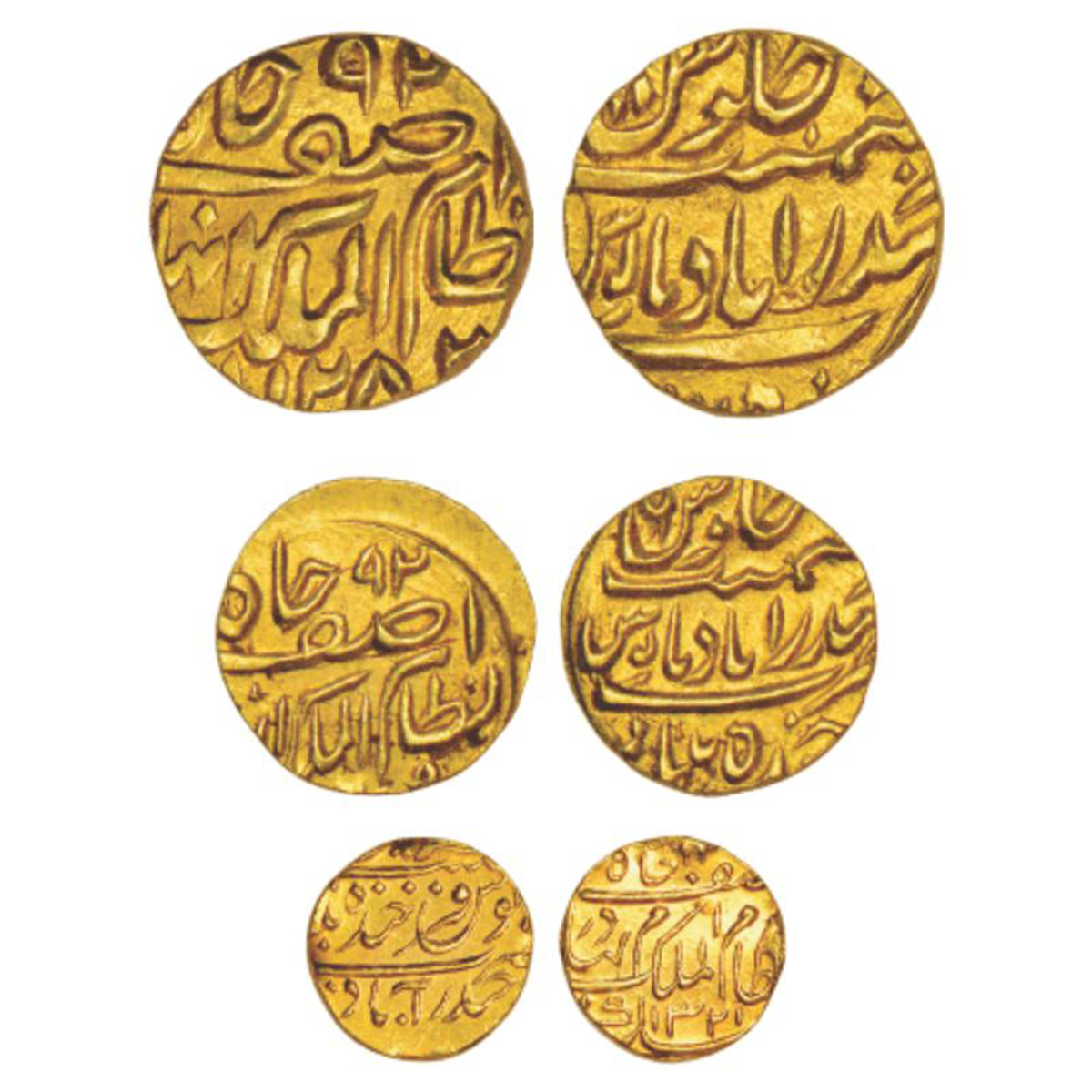 Hyderabad, set of 3 gold coins, Farkhanda Bunyad Hyderabad mint, 2x Afzal ad-Daula, ¼ mohur, AH 1282, KM Y9, 2.80g; ⅛ mohur, KM Y8, 1.41g and 1x Mir Mahbub Ali Khan, 1/16 ashrafi, AH 1321, KM Y19, 0.69g. (3 coins)