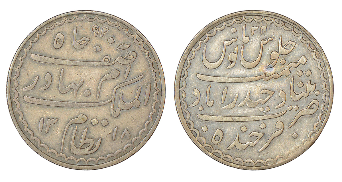 Hyderabad, Mir Mahbub Ali Khan (1869-1911 AD), Charkhi series, silver rupee, Farkhanda Bunyad Hyderabad mint, AH 1318/RY 34, KM Y32, 10.94g.