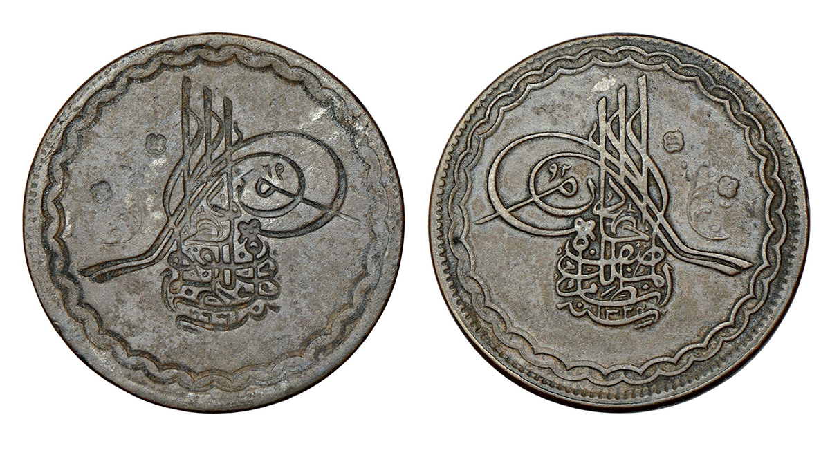 Hyderabad, Mir Mahbub Ali Khan (1869-1911 AD), error copper coins (2), ½ anna, AH 1324, KM Y36, 11.49g and 2 pai, AH 1329, KM 35, 3.72g, obverse part full brockage (Lakhi) with complete die impression on reverse on both coins. (2 coins)