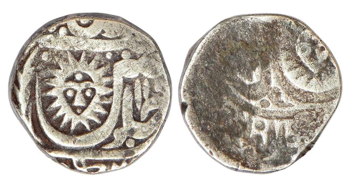 Indore, error silver rupee, Malharnagar mint, sun face type, obverse part brockage (Lakhi) on reverse, 11.06g.