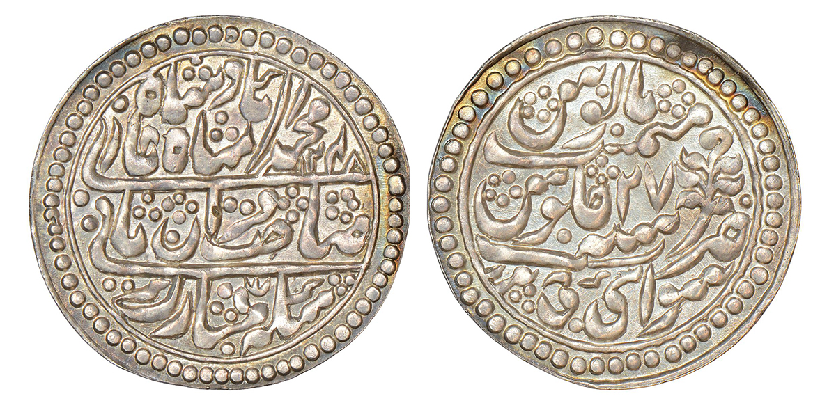 Jaipur, Jai Singh III (1819-1835 AD), Mughal style, silver 'Nazarana' rupee, Sawai Jaipur mint, in the name of Muhammad Akbar II, AH 1248/RY 27, KM 73; Haritwal JAI #92, 35.27mm, 11.40g.