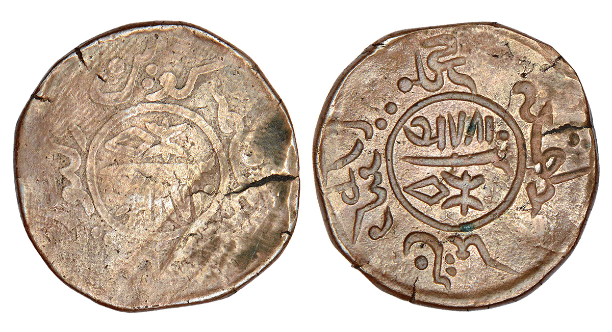 Kutch, Pragmalji II (1861-1875 AD), copper 1½ dokdo, AD 1874, with the name of Queen Victoria, reverse part brockage (Lakhi) on obverse, DR-K 168 type, 9.15g.