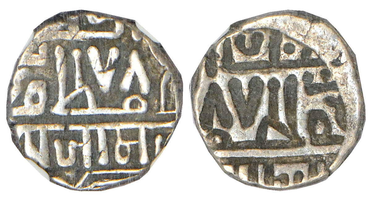 Nawanagar, hammered coinage, error silver kori, frozen AH (9)78, obverse part brockage (Lakhi) on reverse, KM 10.