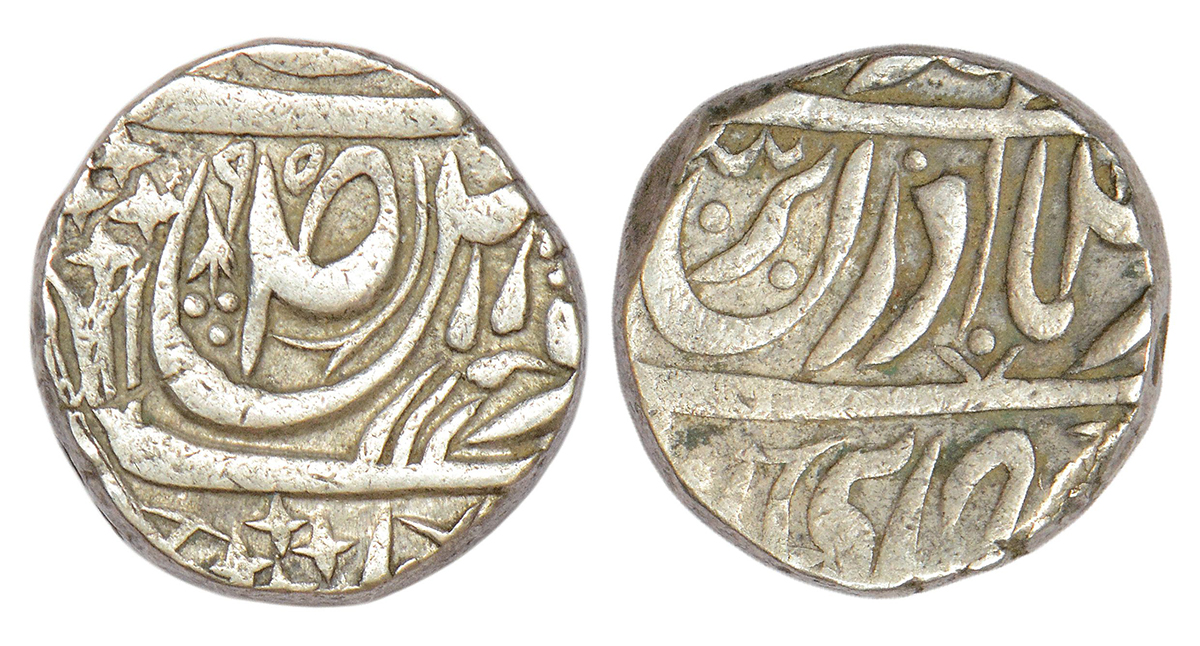 Patiala, Karam Singh (1813-1845 AD), silver rupee, Sahrind mint, 'Qadir Be-Chun' couplet, VS (18)95, in the name of Ahmad Shah Durrani, with flower symbol on reverse, unlisted in KM, 11.03g.