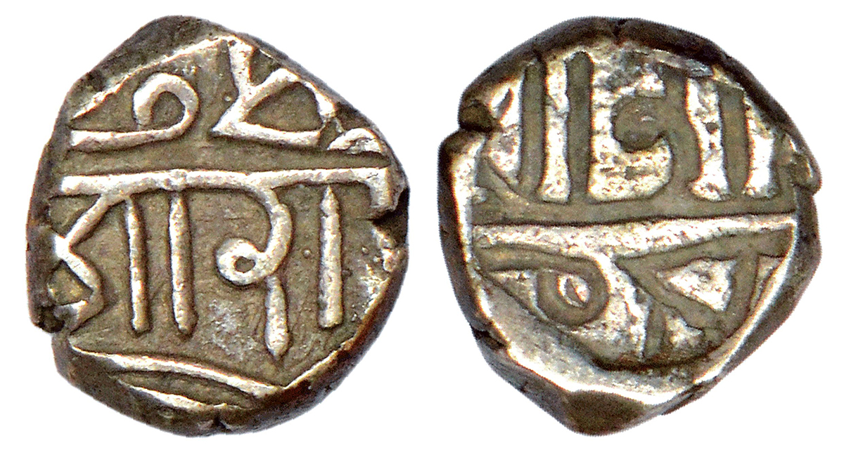 Porbandar, British Protectorate, error silver ¼ kori, with the name of Muzaffar Shah III and Nagari legend Shri Rana, obverse part brockage (Lakhi) on reverse, 1.17g.