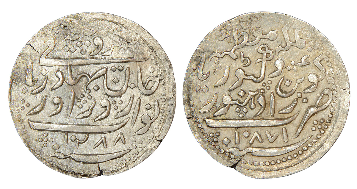 Radhanpur, Zorawar Khan (1825-1874 AD), silver rupee, Radhanpur mint, with the name of Queen Victoria, AH 1288/AD 1871, KM 11, 11.11g.