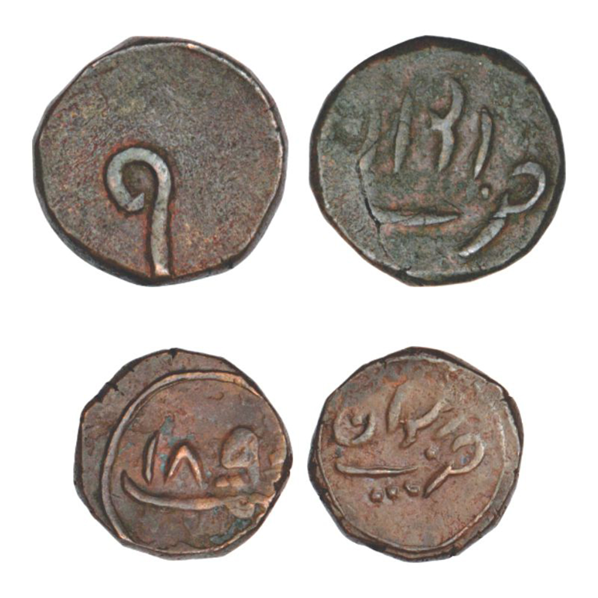 Rewa, Jai Singh Deo (1809-1835 AD), copper paisa (2), 1x KM 12, 14.76g. Obv: Gujarati numeral '1'. Rev: Persian legend Zarb Reewan and 1x KM 11, 6.84g. Obv: VS 1890. Rev: Persian legend Zarb Reewan. (2 coins)