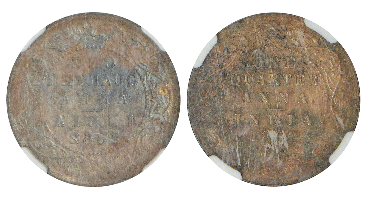 Victoria Queen, copper ¼ anna, 1862, reverse part full brockage (Lakhi) with die impression on obverse.