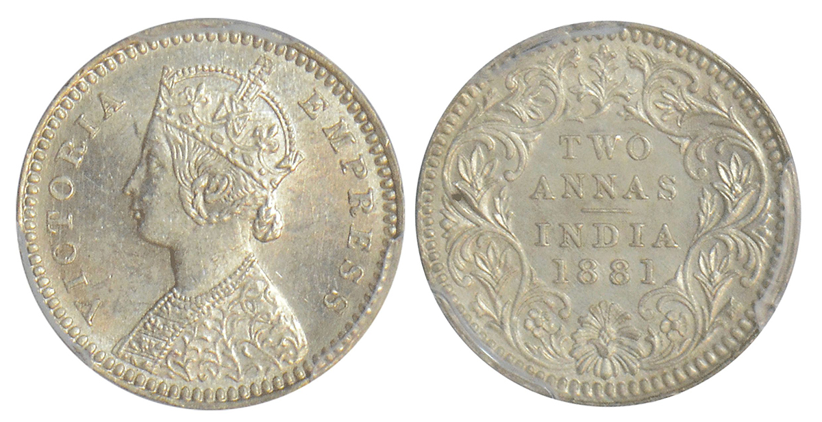 Victoria Empress, silver 2 annas, 1881, Calcutta mint, B/II/'C' incused, PR 496; GK 758.