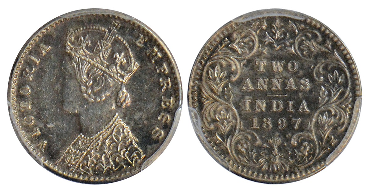 Victoria Empress, re-strike, silver 2 annas, 1897, Calcutta mint, B/II/'C' incused, PR 512; GK 807.