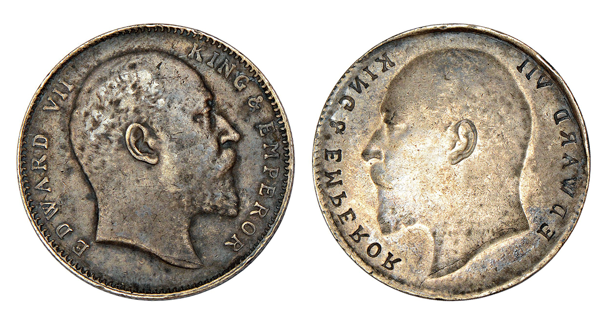 Edward VII, silver rupee, ND (1903-1910 AD), obverse part full brockage (Lakhi) with complete die impression on reverse, 11.62g.
