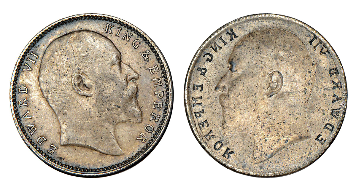 Edward VII, silver rupee, ND (1903-1910 AD), obverse part full brockage (Lakhi) with complete die impression on reverse, 11.66g.