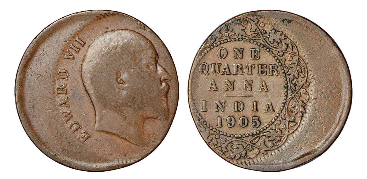 Edward VII, error copper ¼ anna, 1905, Calcutta mint, no mint mark, PR 649; GK 996.