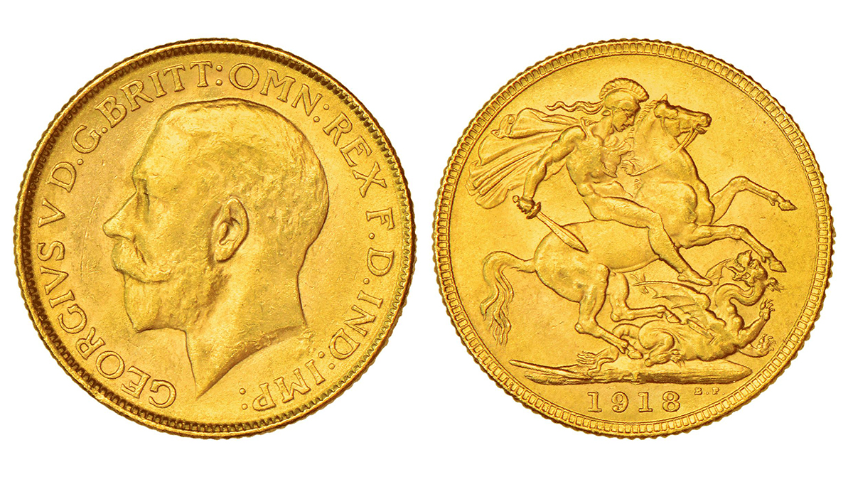 George V, gold sovereign, 1918, Bombay mint, 'I' mintmark, S&W 8.5; PR 27, 7.98g. Obv: Bare head of the king facing left, B.M. in relief, legend around. Rev: St George slaying the dragon right, date and mintmark below.