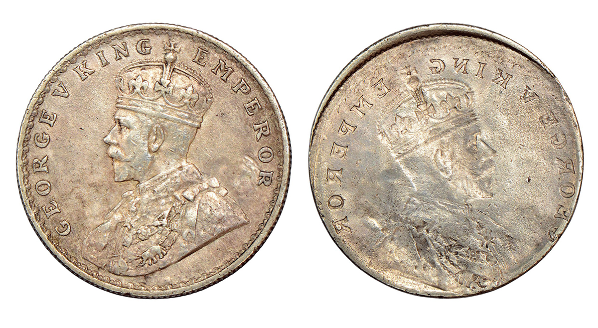 George V, silver rupee, ND (1911-1922 AD), obverse part full brockage (Lakhi) with die impression on reverse, 11.58g.