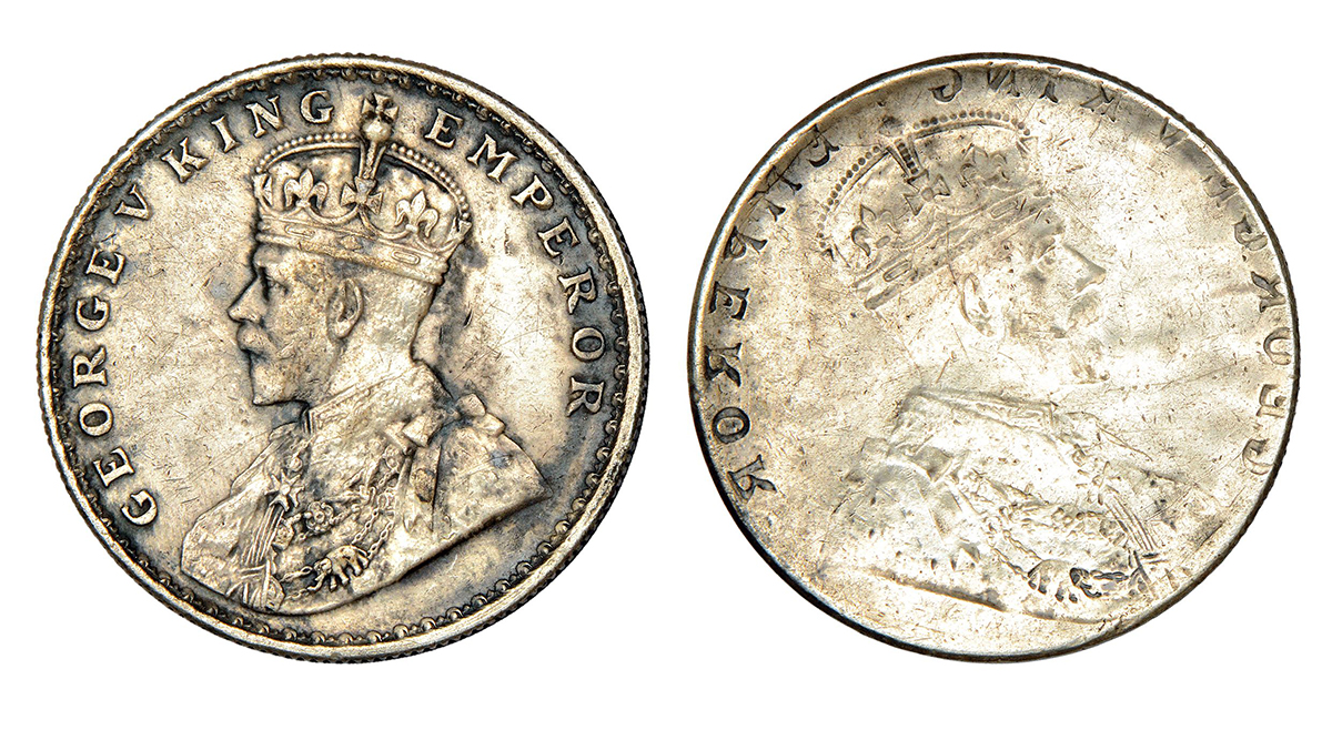 George V, silver rupee, ND (1911-1922 AD), obverse part brockage (Lakhi) with die impression on rev...