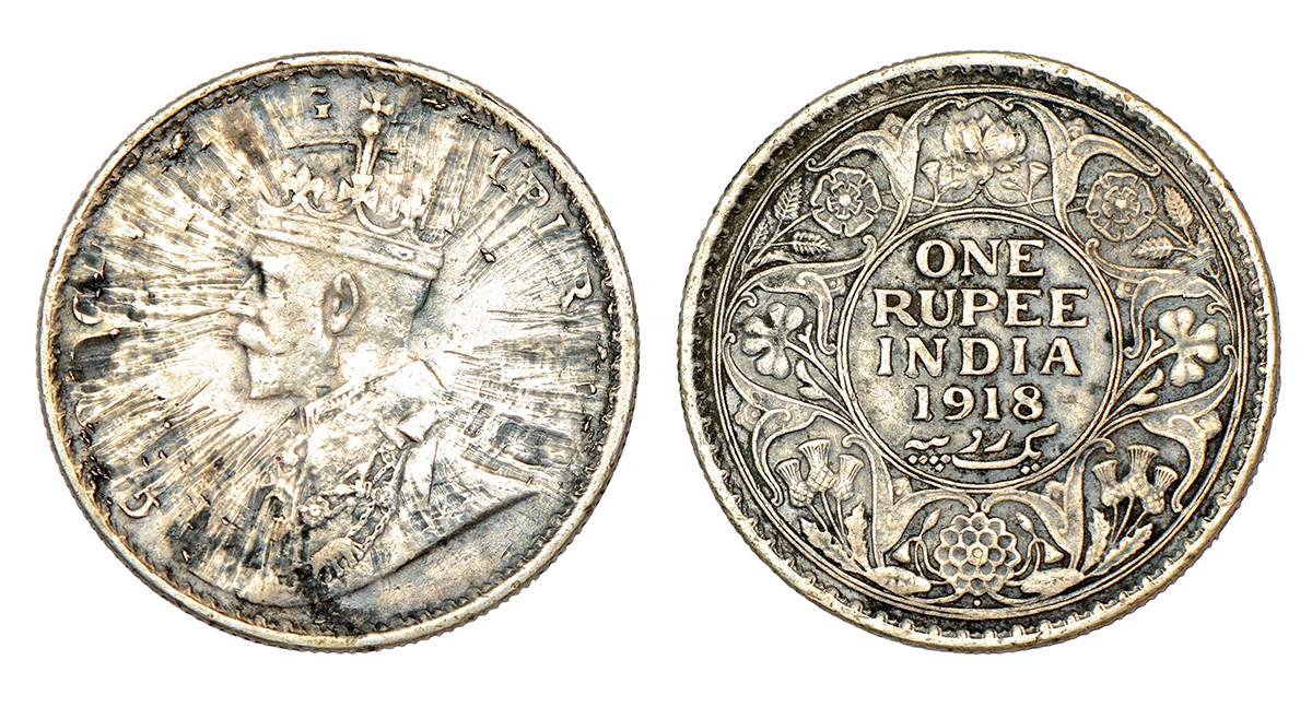 George V, silver rupee, 1918, Bombay mint, dot, PR 224; GK 1038. ...
