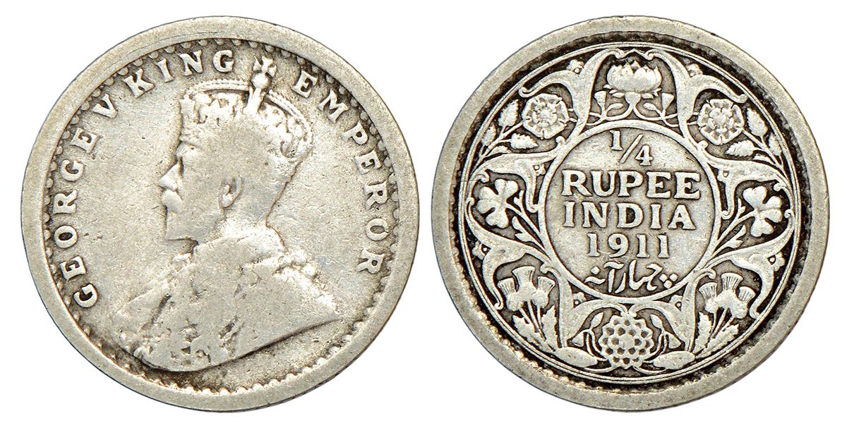 George V, silver ¼ rupee, 1911, Calcutta mint, no dot, pig type, PR 440; GK 1080. ...