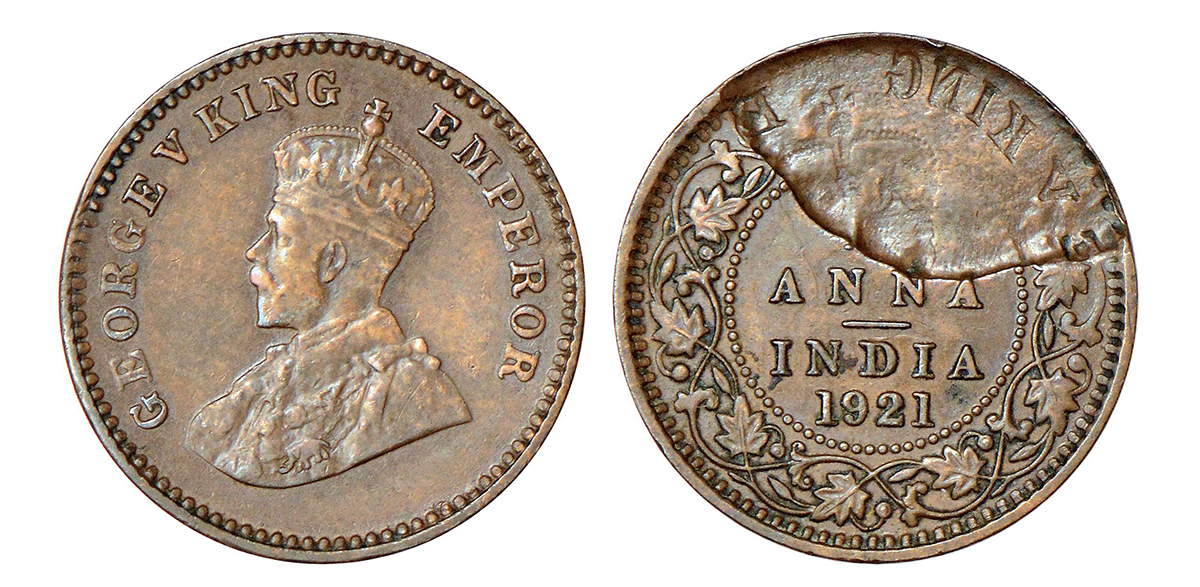 George V, copper 1/12 anna, 1921, Calcutta mint, no dot, obverse part partial brockage (Lakhi) on reverse, PR 836; GK 1232, 1.63g.