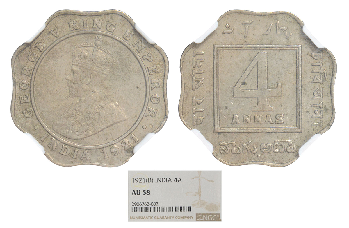 George V, cupro-nickel 4 annas, 1921, Bombay mint, dot, PR 879; GK 1106.