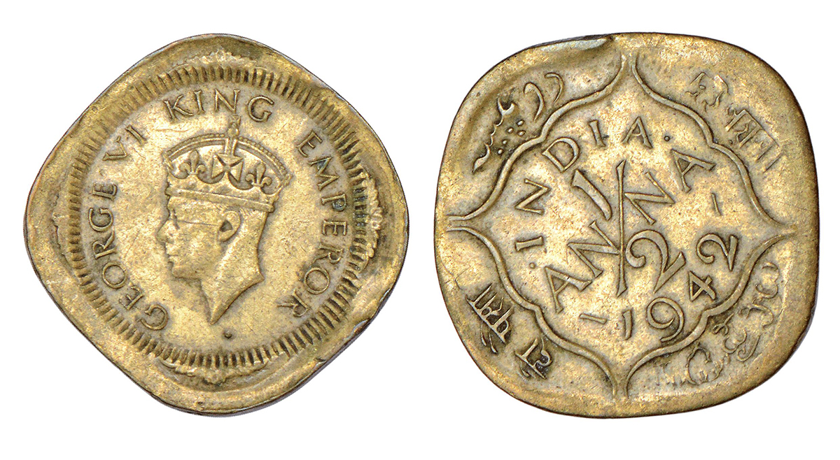 George VI, error nickel-brass 2 annas, 1943, Bombay mint, head type II, PR 919; GK 1360-1361, 5.74g...