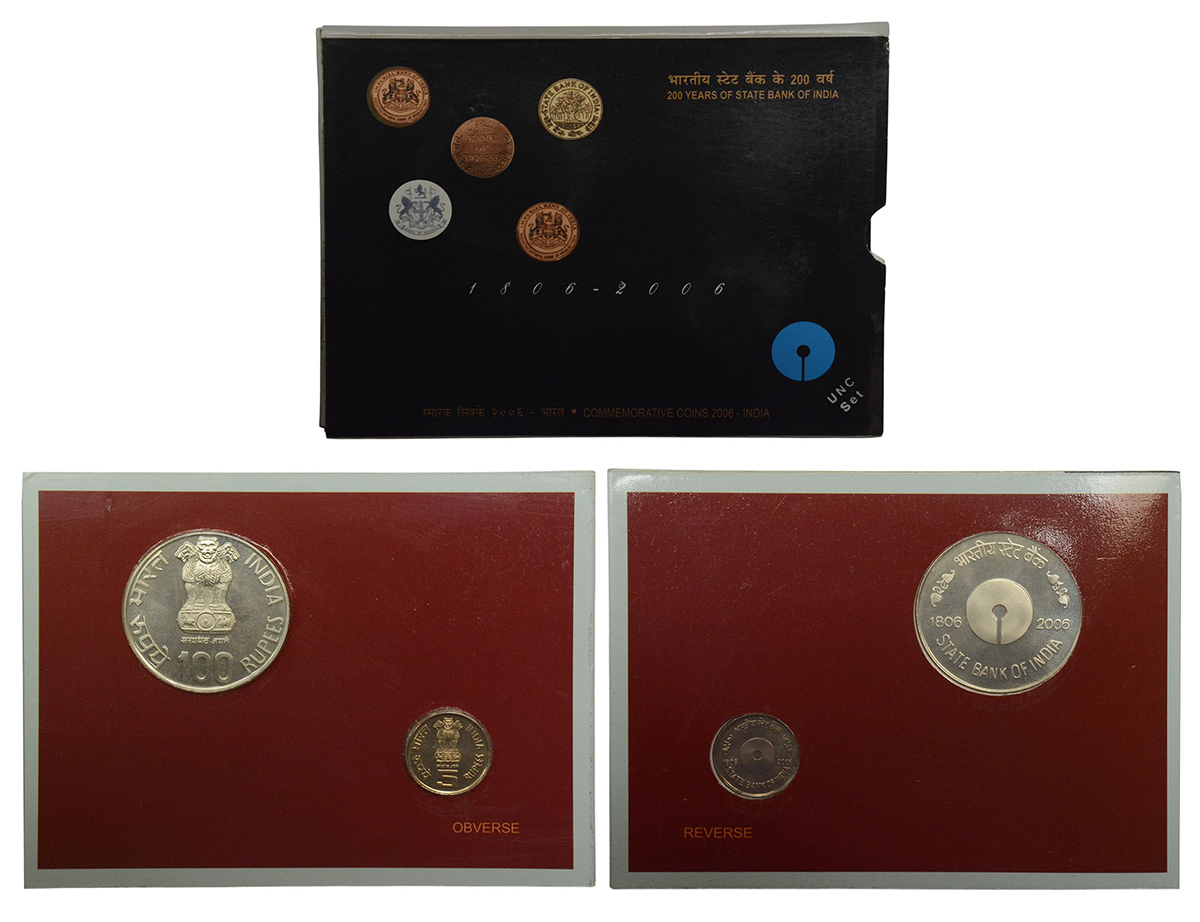 2006, 200th years of State Bank of India, UNC set of 2 coins, 100 rupees and 5 rupees, Kolkata mint, RB 298, in original mint packing.
