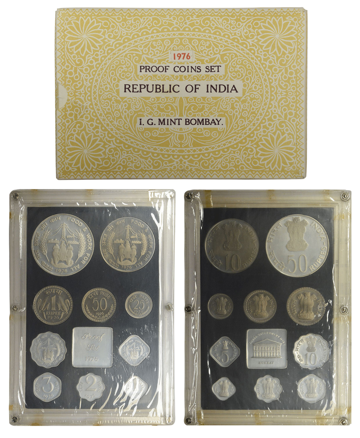 1976, Food & Work for All, Proof set of 10 coins, 50 rupees, 10 rupees, 1 rupee, 50 paise, 25 paise, 10 paise, 5 paise, 3 paise, 2 paise and 1 paisa, Bombay mint, RB 55, in original mint packing.