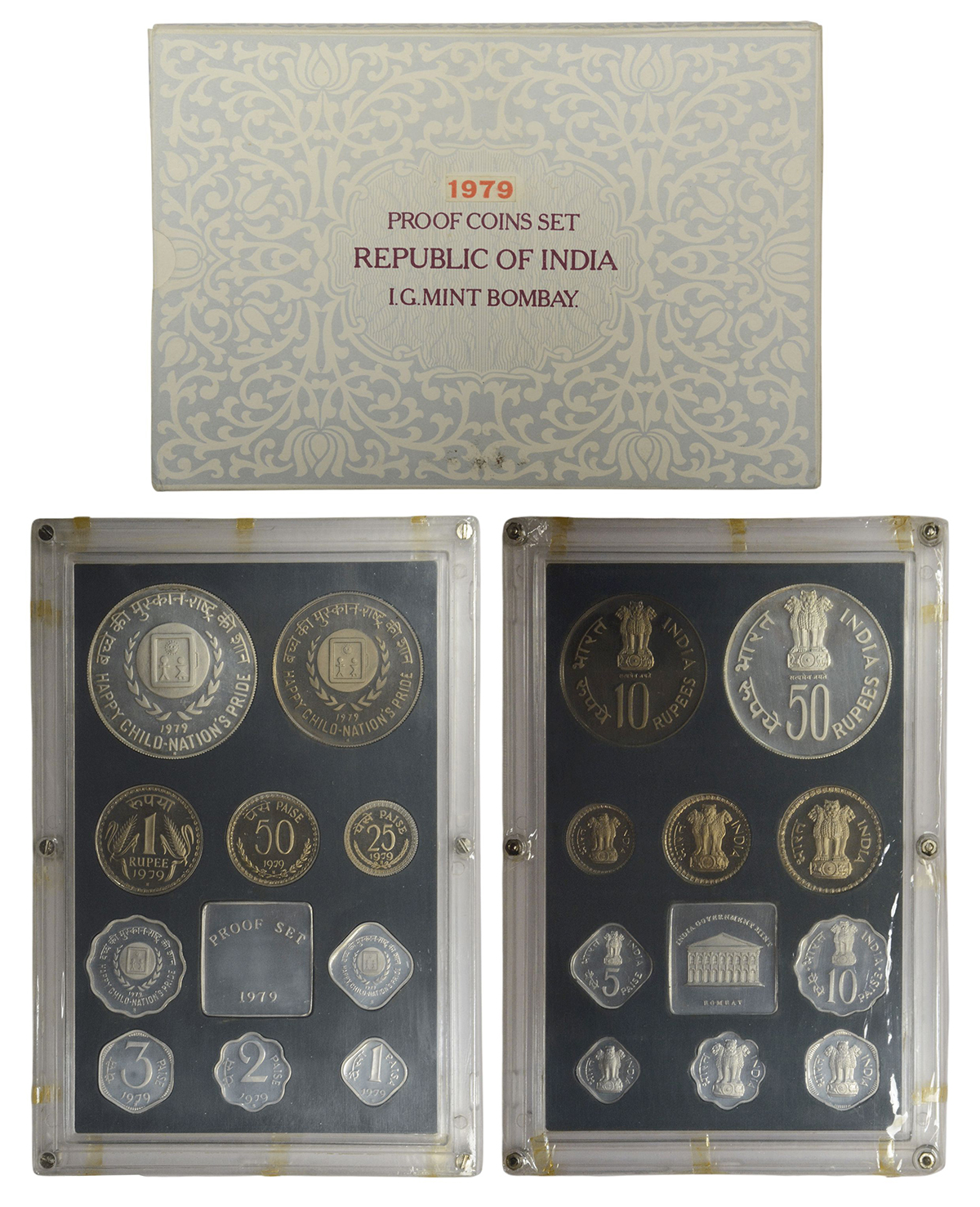 1979, Happy Child Nation's Pride, Proof set of 10 coins, 50 rupees, 10 rupees, 1 rupee, 50 paise, 25 paise, 10 paise, 5 paise, 3 paise, 2 paise and 1 paisa, Bombay mint, RB 71, in original mint packing.