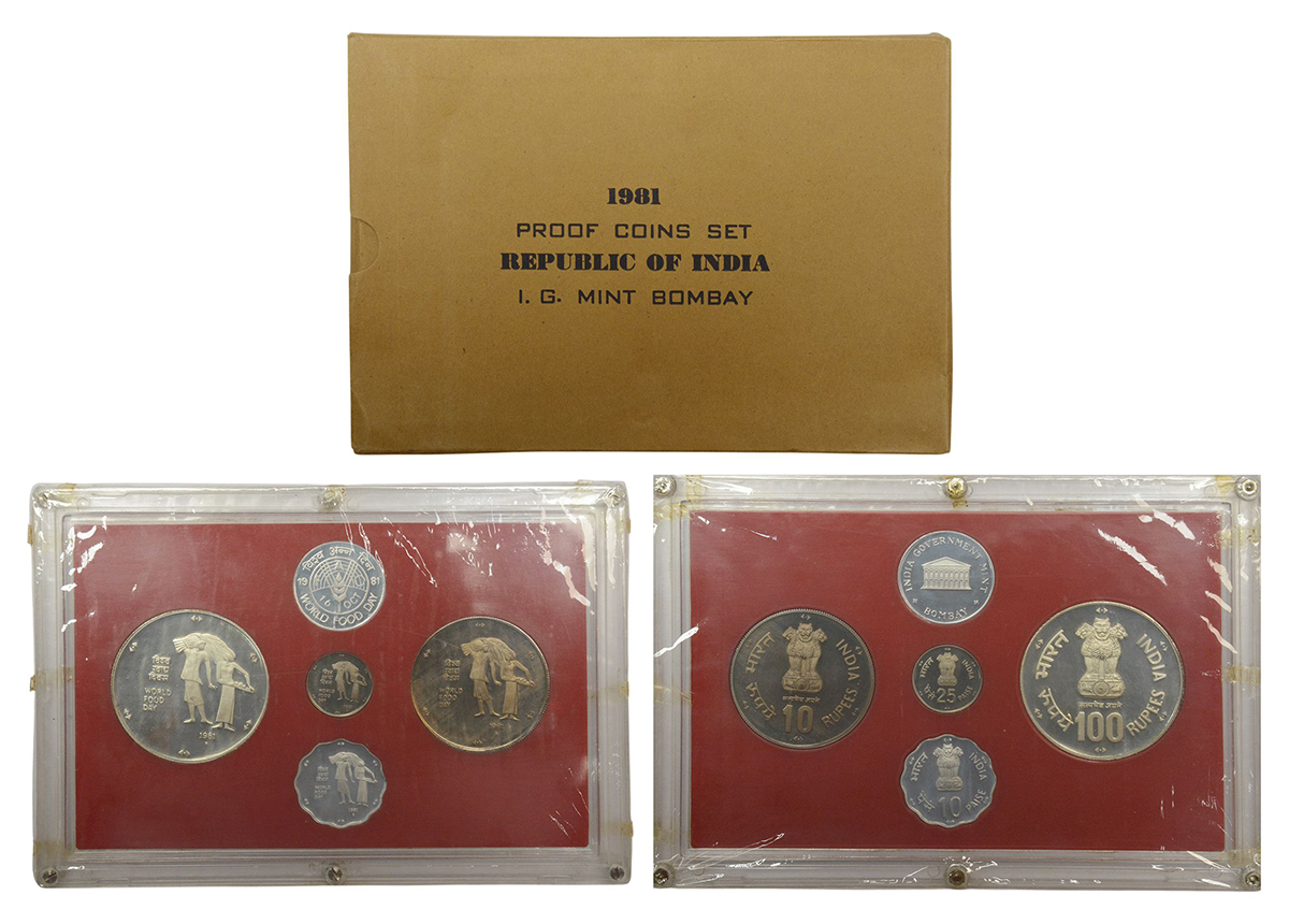 1981, World Food Day, Proof set of 4 coins, 100 rupees, 10 rupees, 25 paise and 10 paise, Bombay Mint, RB 83, in original mint packing.