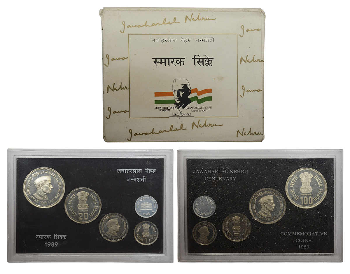 1989, Jawaharlal Nehru birth centenary, Proof set of 4 coins, 100 rupees, 20 rupees, 5 rupees and 1 rupee, Bombay mint, RB 135, in original mint packing.